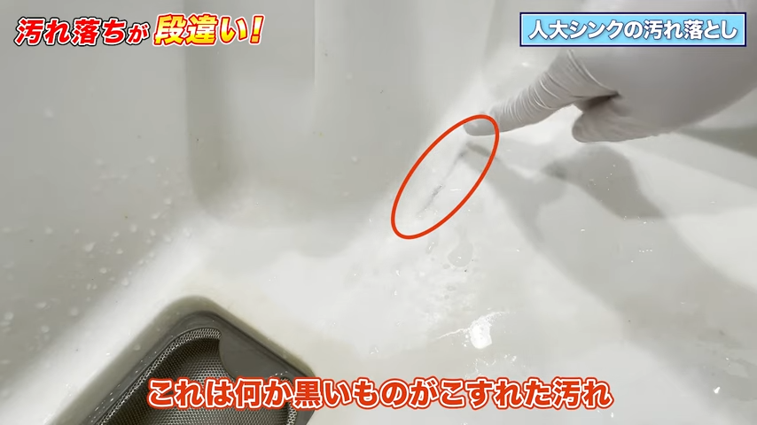人工大理石製シンク(黒いスジ、黒ずみ): 水だけであっという間に汚れが落ち、高い効果を確認しました。