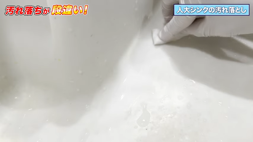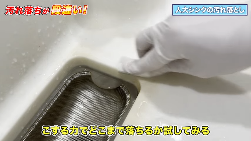 わが家のシンクは白い人工大理石製なのですが、いつも手早く落としたいときは塩素系をかけて放置する方法で掃除していました。