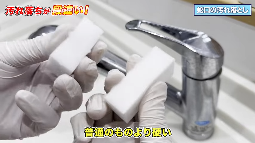 ちなみに硬さを比べてみると……左側が一般的なメラミンスポンジなのですが、押して比べてみると硬さがまったく違いますね。
