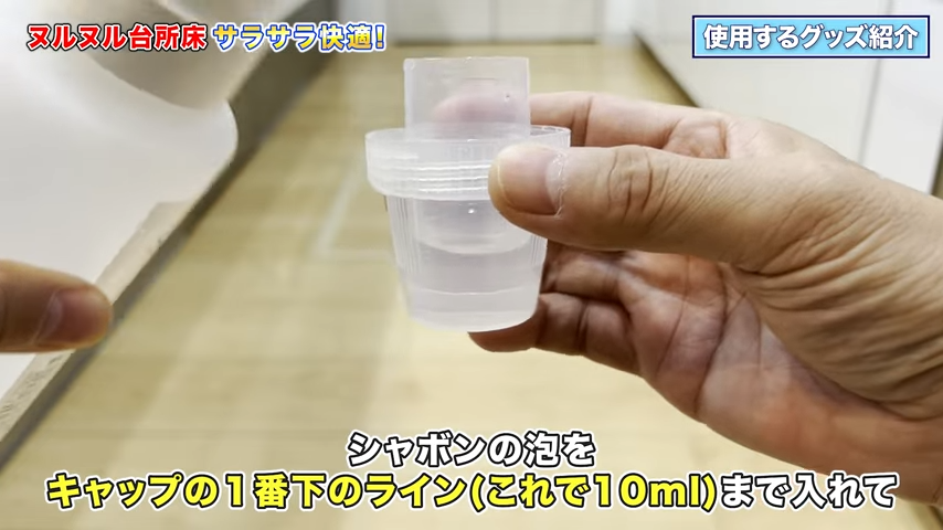 ここに「シャボンの泡」を加えて、拭き掃除用の液を作っていきます。
