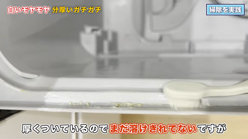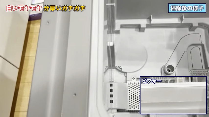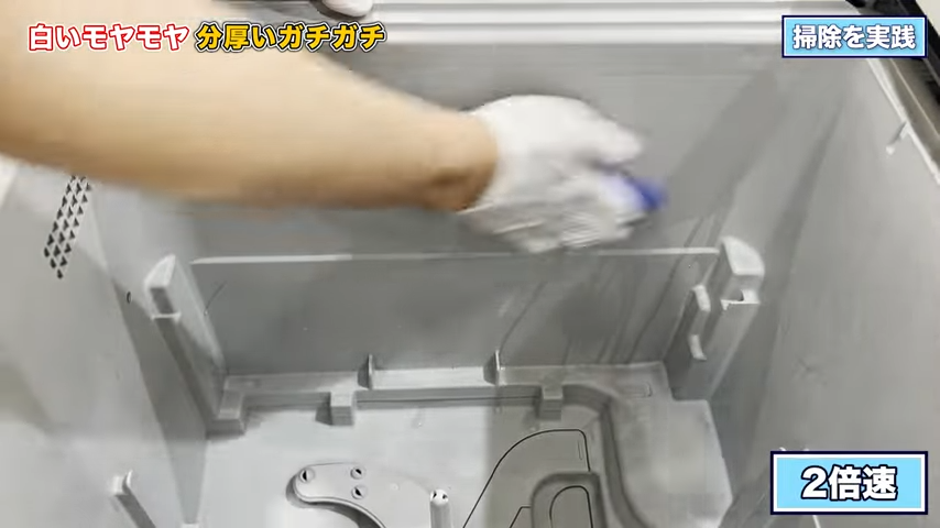 食洗機内に蓄積した白い水垢を、クエン酸と「茂木和哉トイレ尿石落としジェル」で除去する方法です。