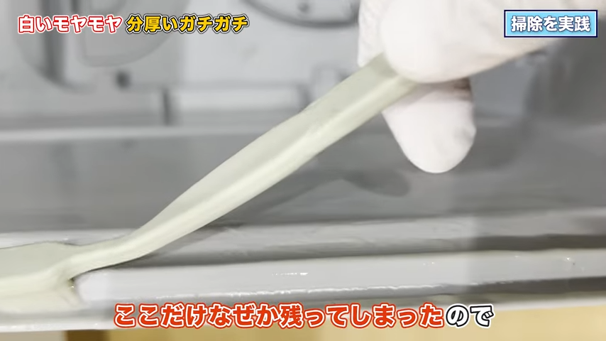 1〜2分放置したあとに見てみると、だいぶ溶けていっていますね。ただ、よく見るとまだ一部落ちていないところがあります。ここは「超人たわしZ」でピンポイントでこすっていきます。