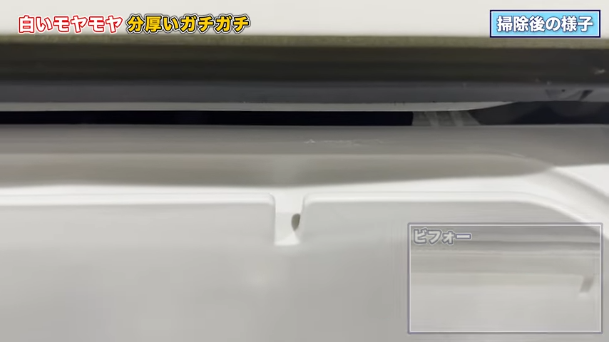 ドア手前にあるグレーのプラスチック部分も、白っぽさが取れてスッキリしました。反対側の分厚い水垢もキレイになっています。隙間の水垢がちょっと残っていますが、これは磨き忘れですね。ちゃんと磨いたところは落ちていました。