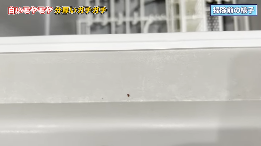 それと食洗機の内側にも、白っぽいモヤモヤした水垢がついています。ぐるっと筋みたいに残っていて、爪でこすると少し取れるんですよね。こういう汚れが残ると、見た目がちょっと気になってしまいます。