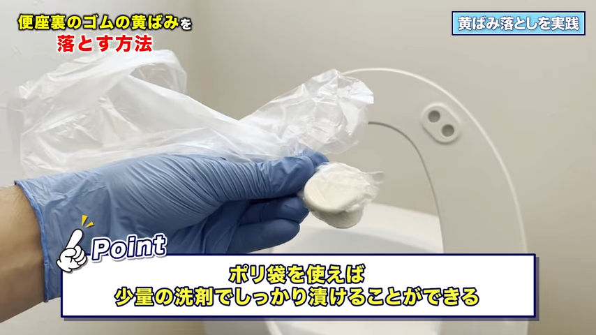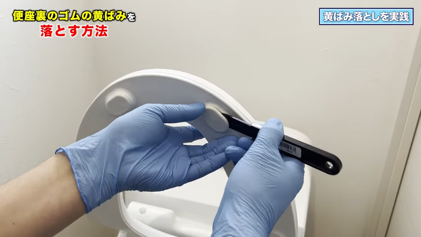 2つ目はトイレの便座裏についているゴムの黄ばみを落としていく動画。いつの間にか黄ばんでいたりするけれど……そんなガンコな汚れも、家にあるもので落とせるんだって。