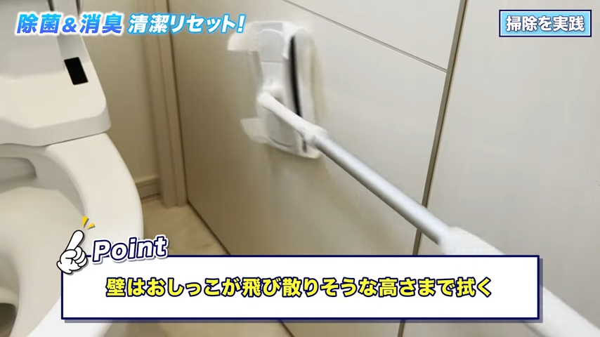 あとはペーパータオルをワイパーにセットして、洗浄液を吹きかけてから壁や床を拭いていくよ。特に尿が飛び散りやすい下のほうは、ワイパーを押し当てて丁寧に拭くのがポイントだって!