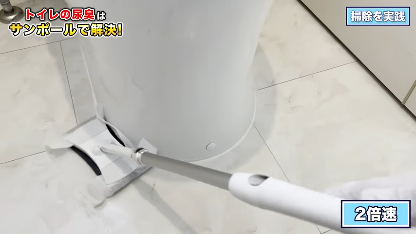 4つ目は「サンポール」を使ってトイレの床についたおしっこ臭を「サンポール」で取る動画。おしっこ汚れはアルカリ性だから、酸性洗浄剤なら原因から断ち切ることができるんだって。